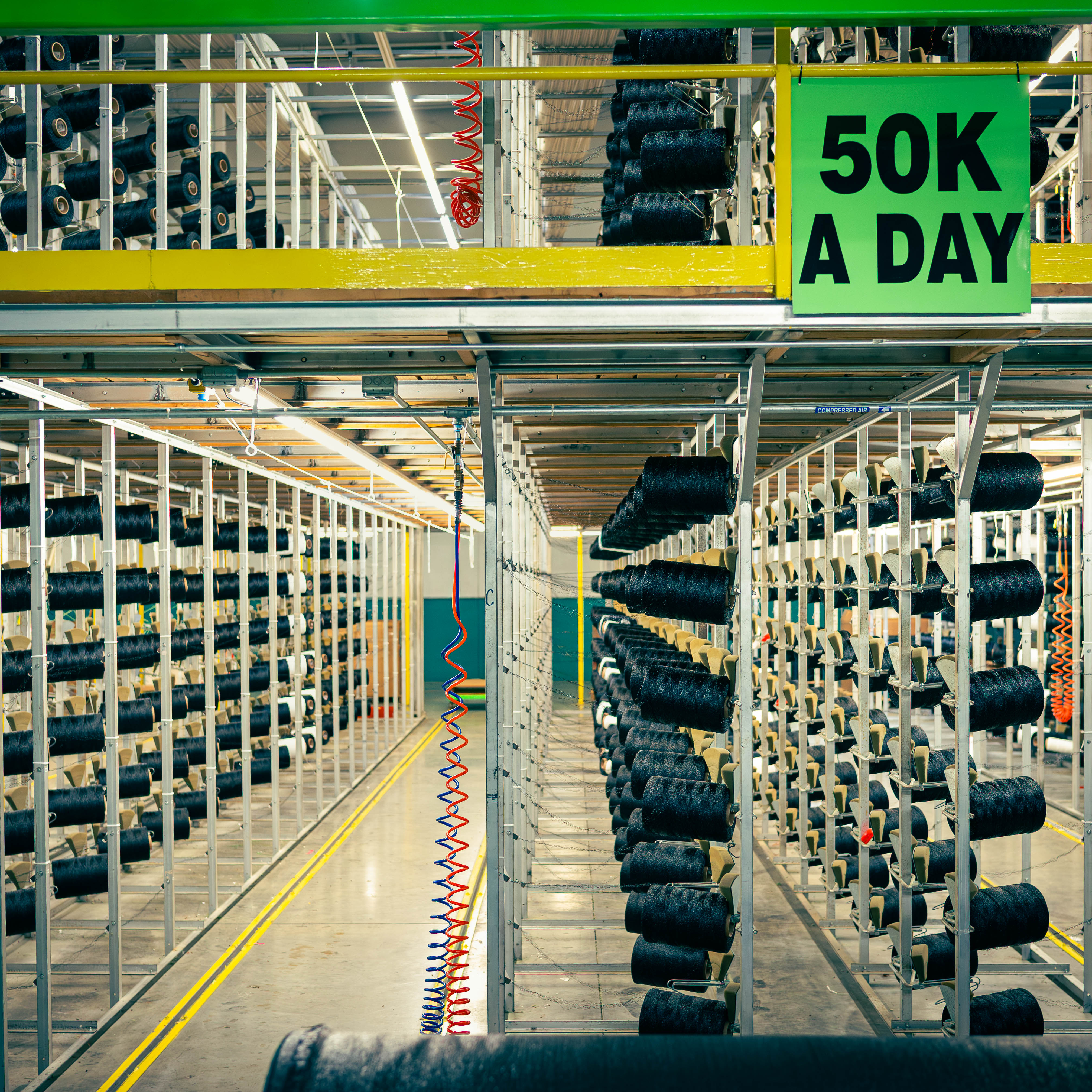 Photo left: Black nylon yarn being tufted