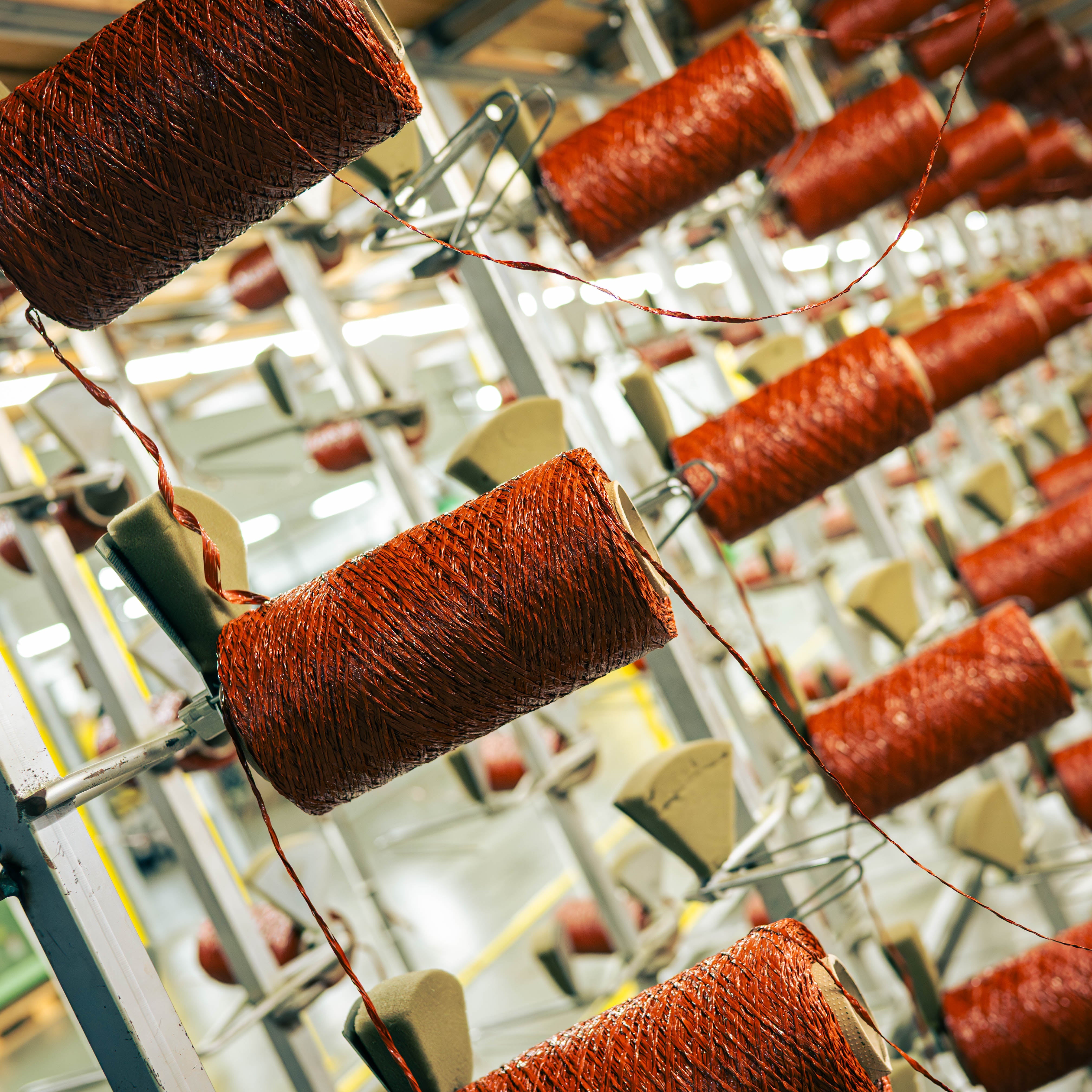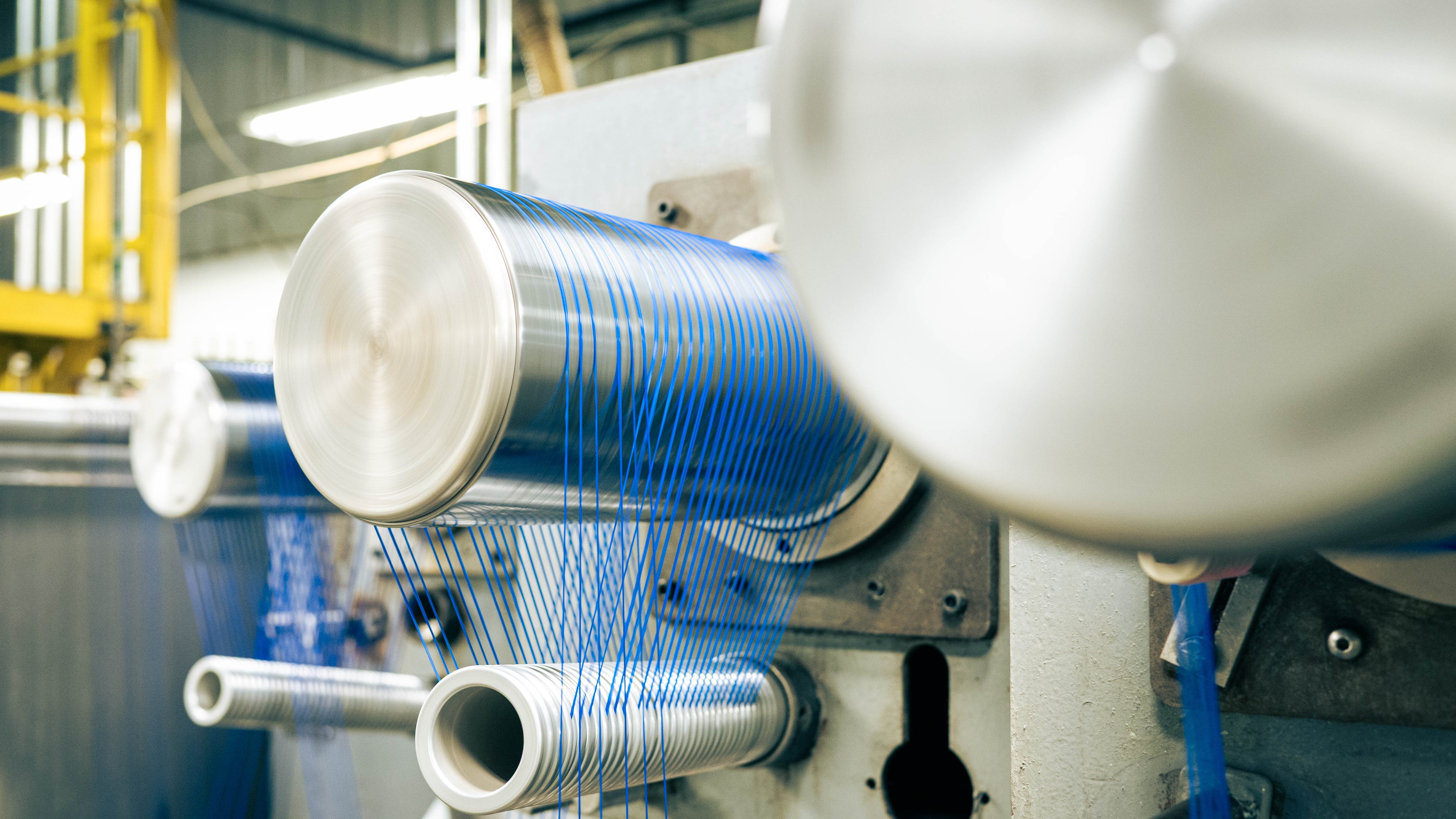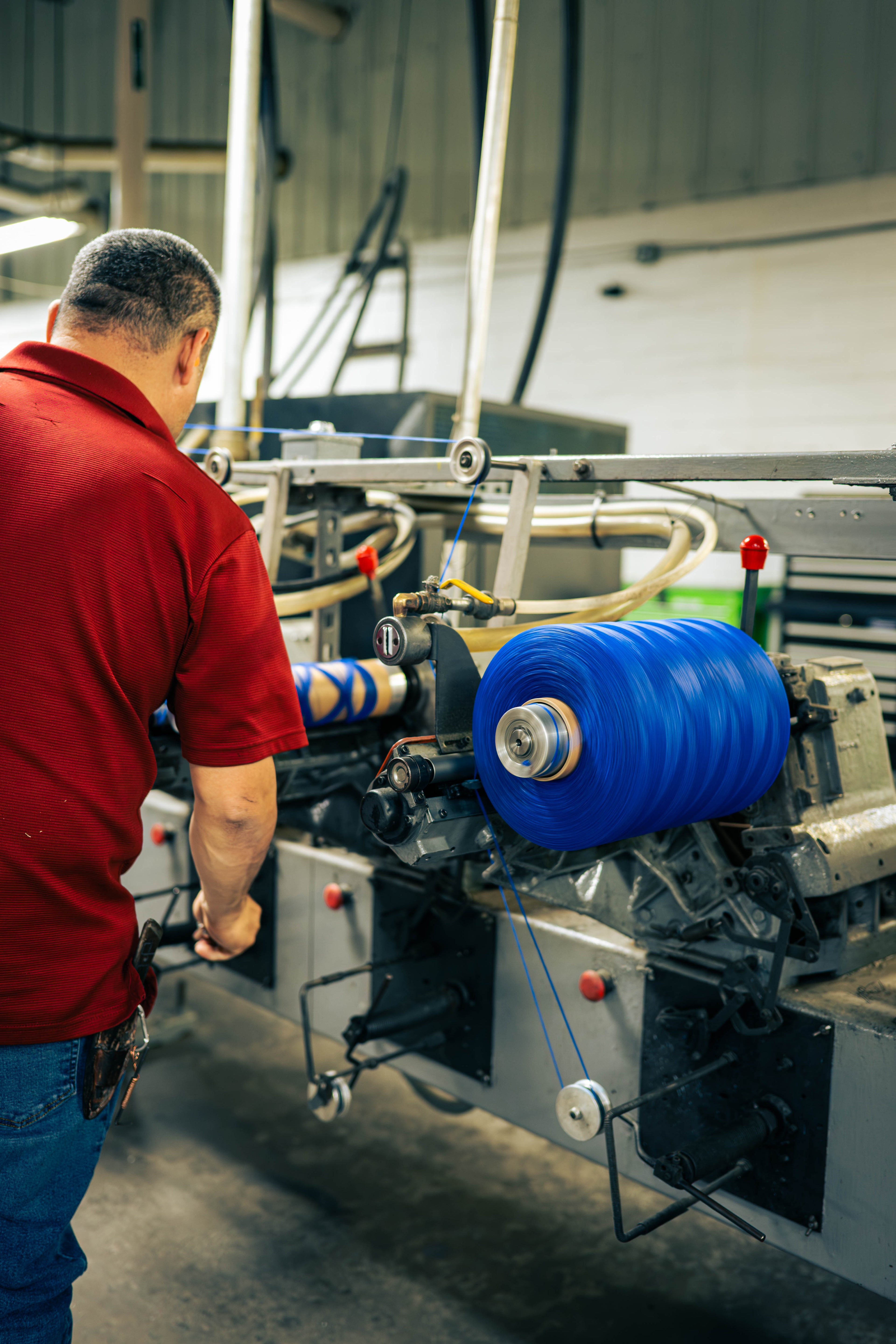 Photo left: Custom blue Nylon Yarn being extruded