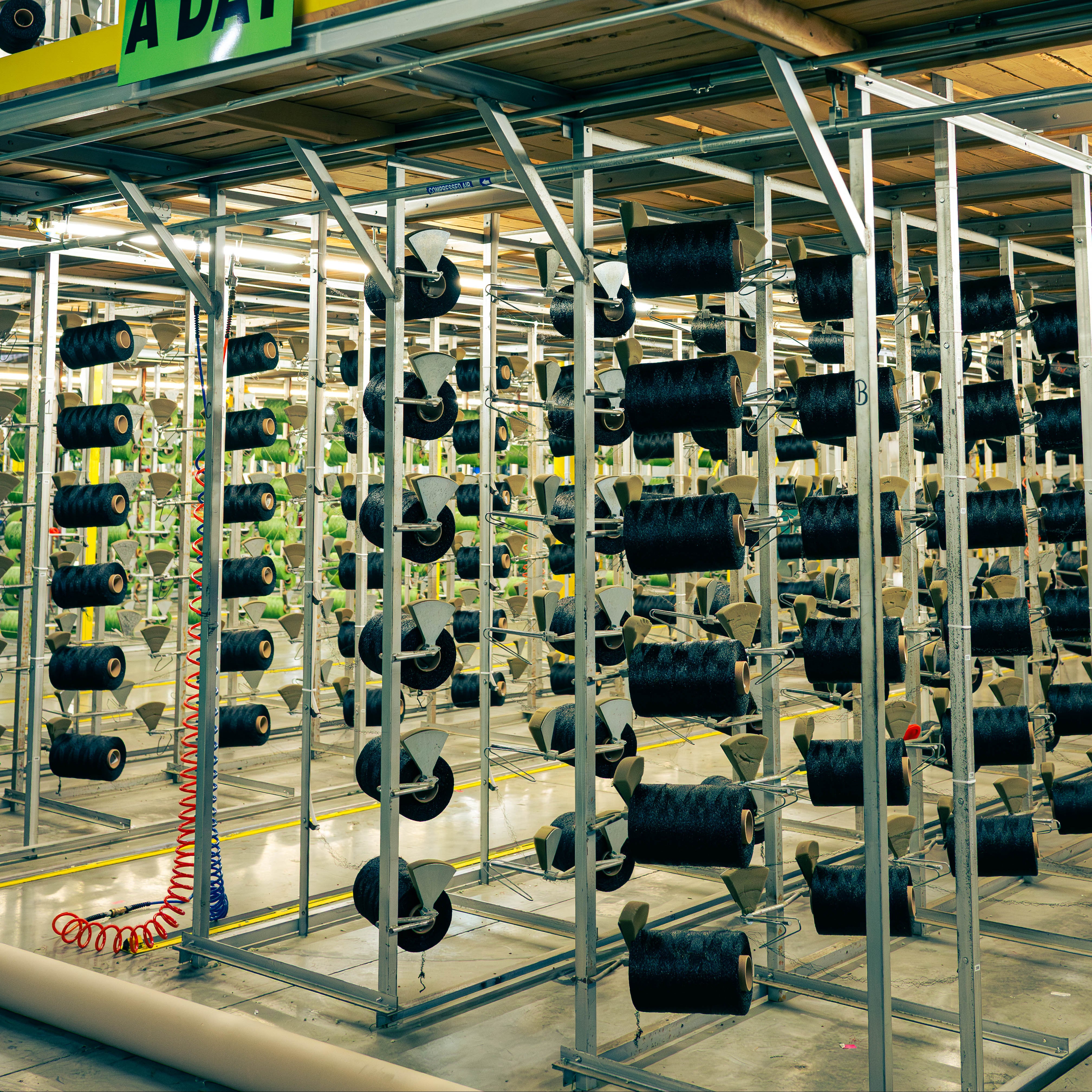 Photo left: Our Nylon yarn on the line being tufted into turf.