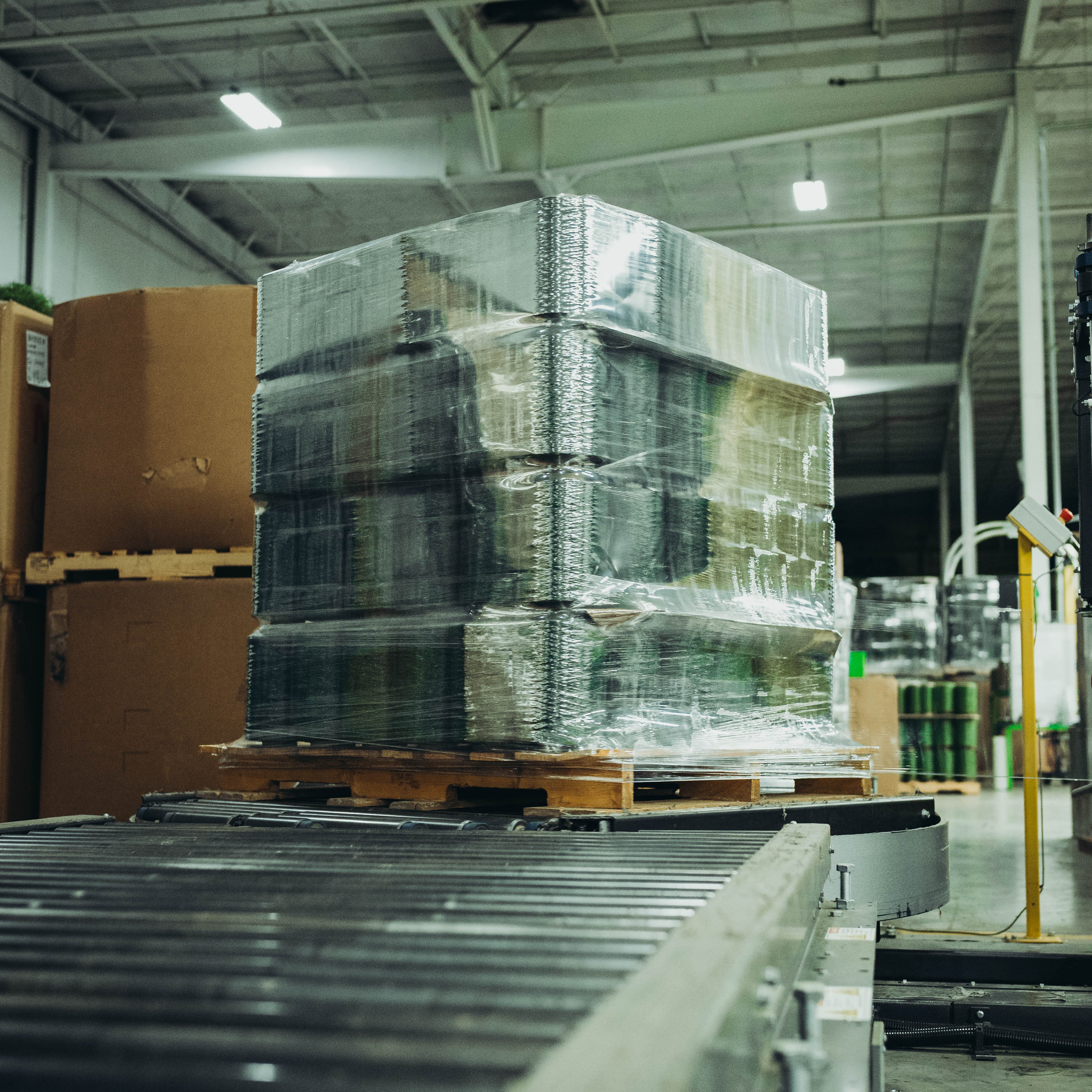 Photo left: A pallate full of nylon yarn being packaged ready to be shipped