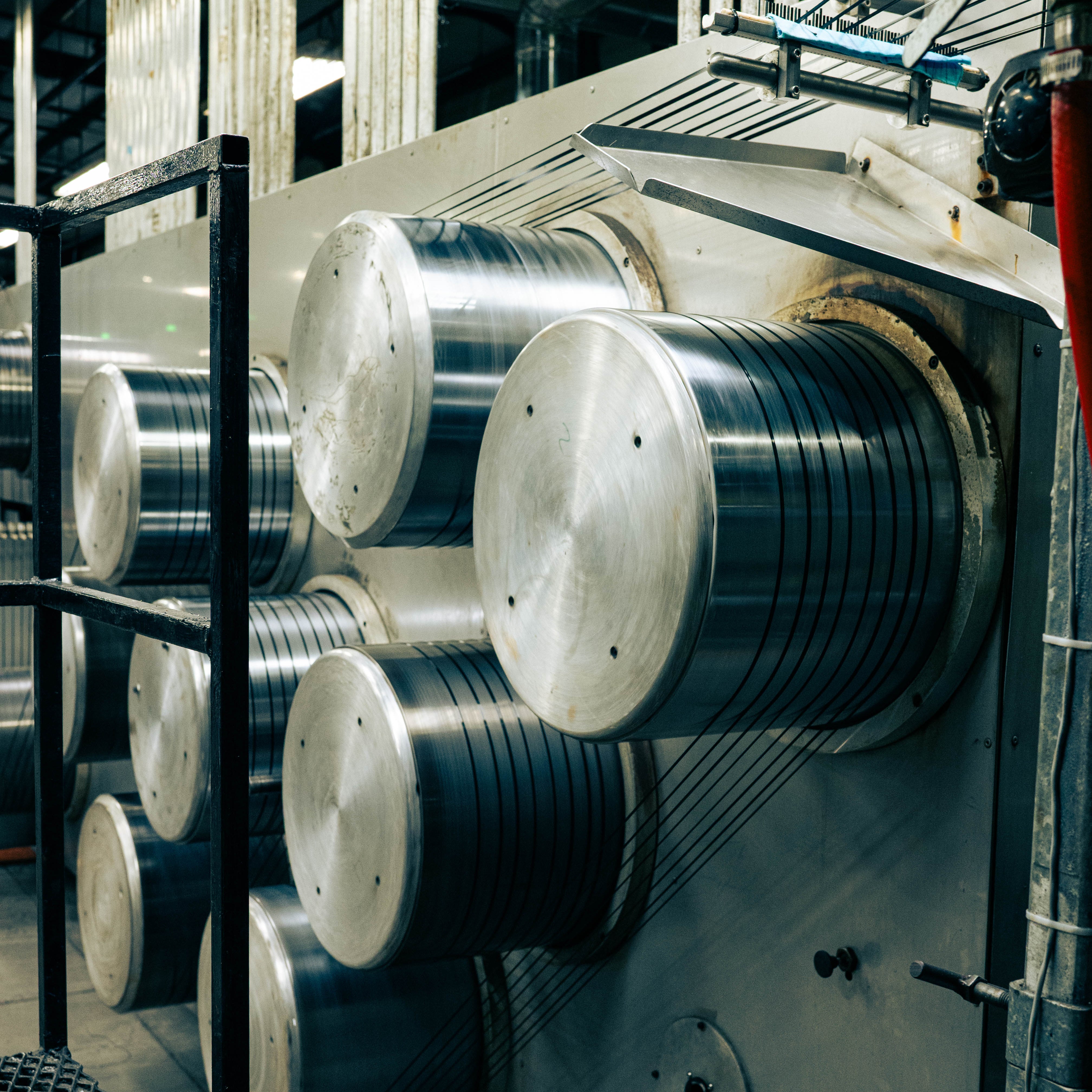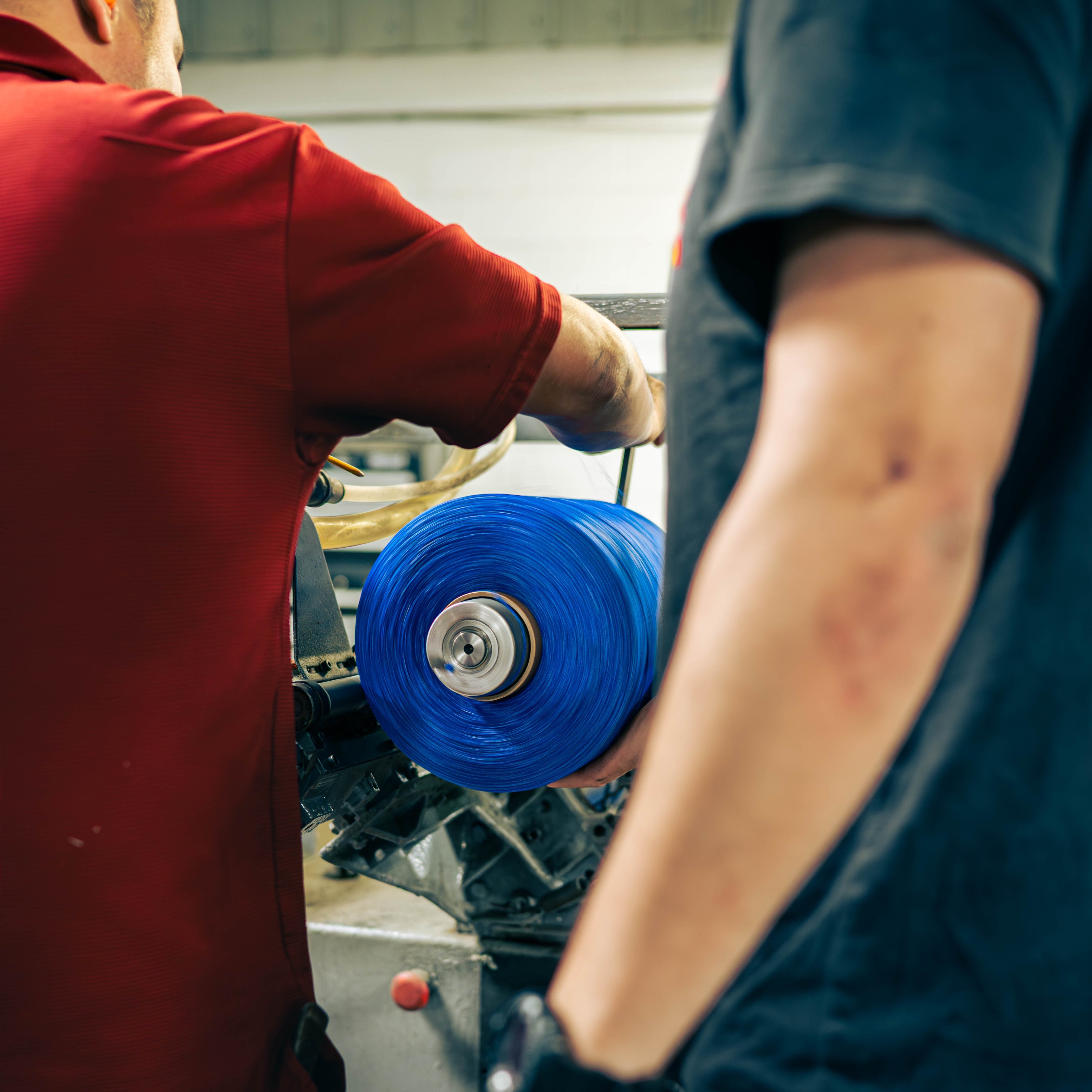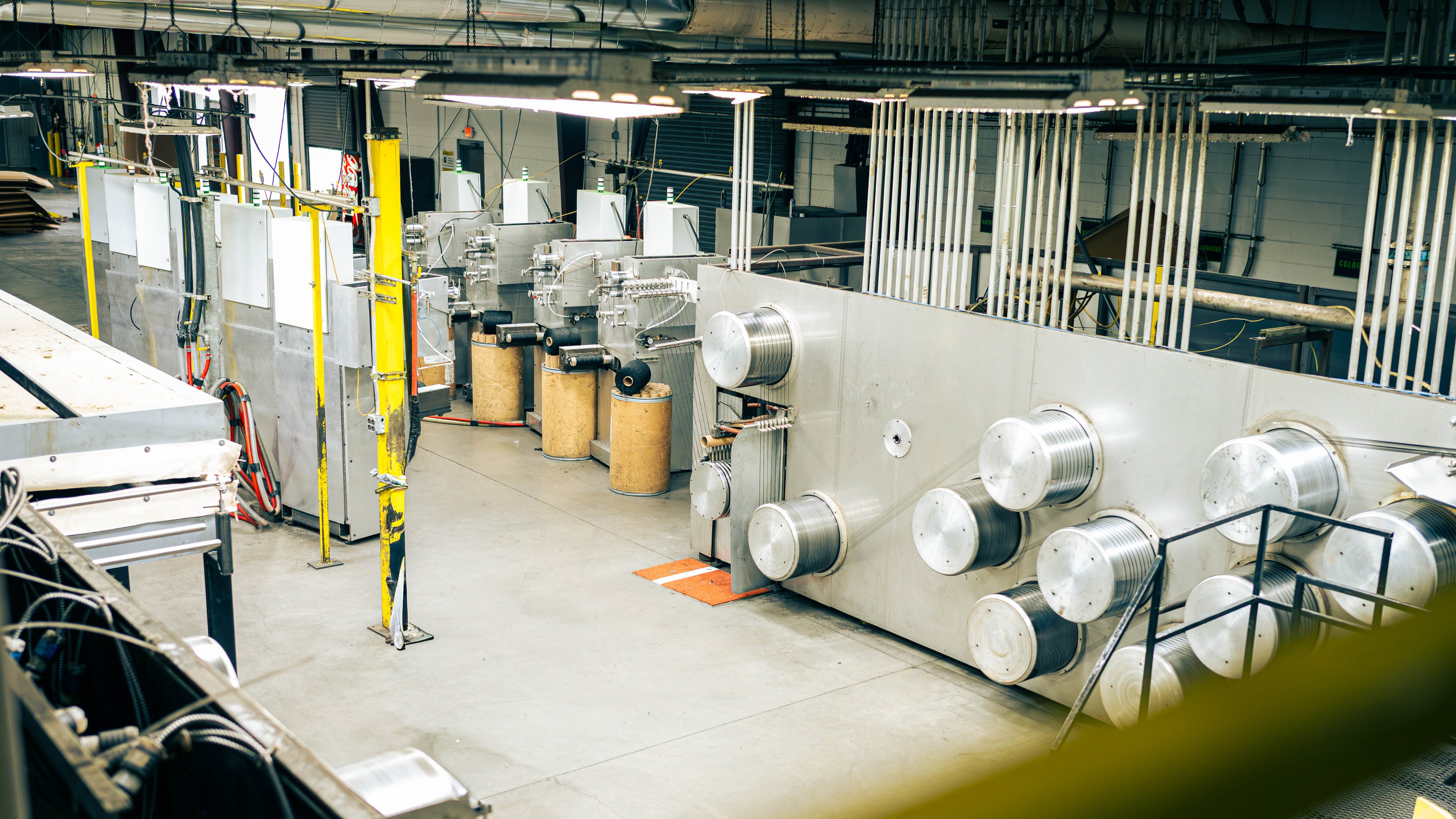 Photo right: Multiple rolls of Nylon yarn being extruded at the LexLawn location.